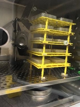 3.5 GHz: compact mode-stirred reverberation chamber incubator adapted for specific biological holders dedicated to skin cells; the incubator will also preserve the biological proper environment, and allow long time (several hours, days) exposure to 5G signals (installed in CNRS-Bordeaux).